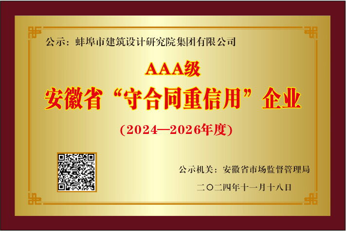 2024年11月18日,蚌埠市建筑設(shè)計(jì)研究院集團(tuán)有限公司榮獲安徽省AAA級“守合同重信用”企業(yè)稱號。