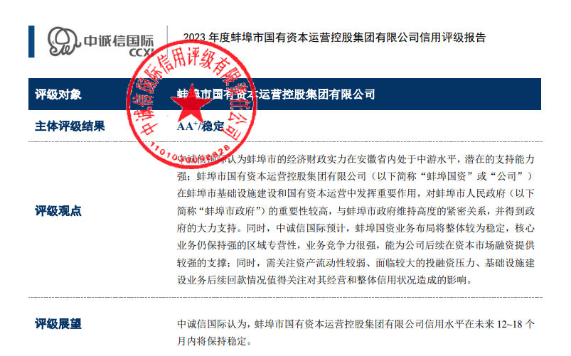 2023年9月4日,經中誠信國際信用評級有限公司評定,蚌埠市國有資本運營控股集團有限公司再次成功獲評AA+主體信用評級,評級展望為穩(wěn)定,時效期為一年。這是蚌埠國控集團繼2022年8月5日獲得東方金誠國際信用評估有限公司評定的AA+主體信用評級后,再次評為AA+級信用主體,實現了AA+主體信用“雙評級”。